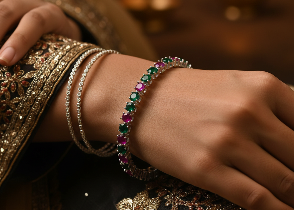 I fell in love with this bangle the moment I saw it! The green and ruby stones sparkle beautifully, and silver finish gives it such an elegant look. It’s lightweight, comfortable to wear all day, and goes perfectly with both casual and festive outfits. I’ve already received so many compliments — totally worth it!