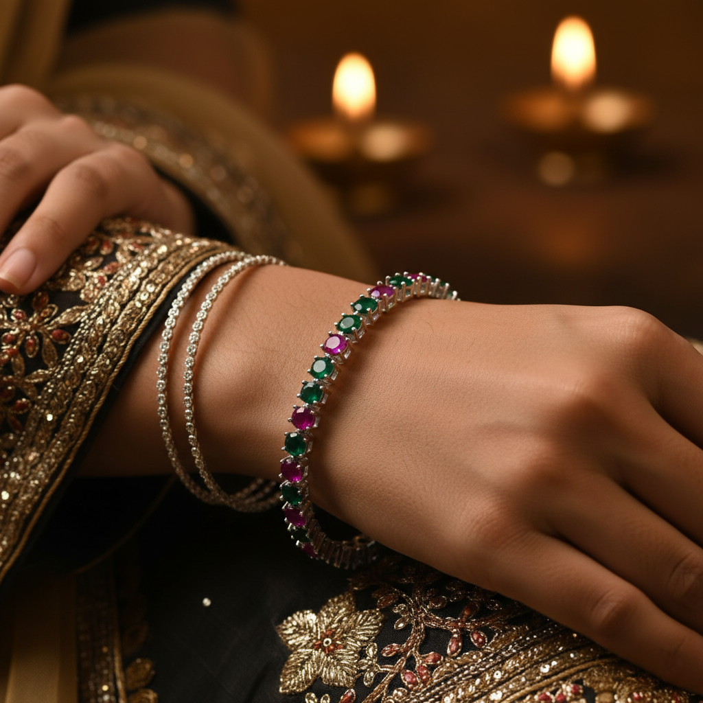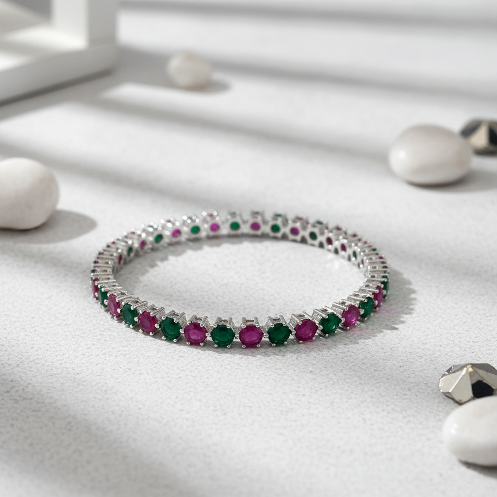 Add Ruby Emerald Bangle in 92.5 Italian Sterling Silver | Handcrafted Gemstone Bangle for Women to the cart