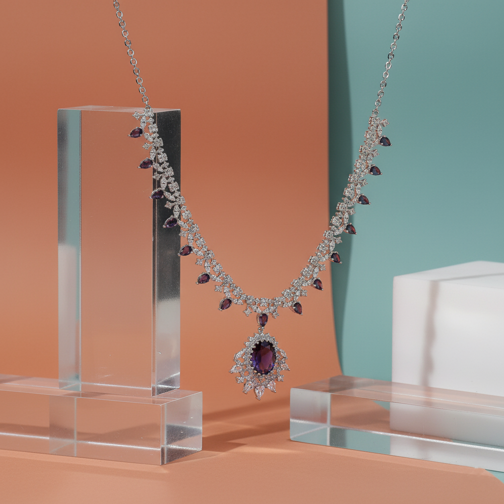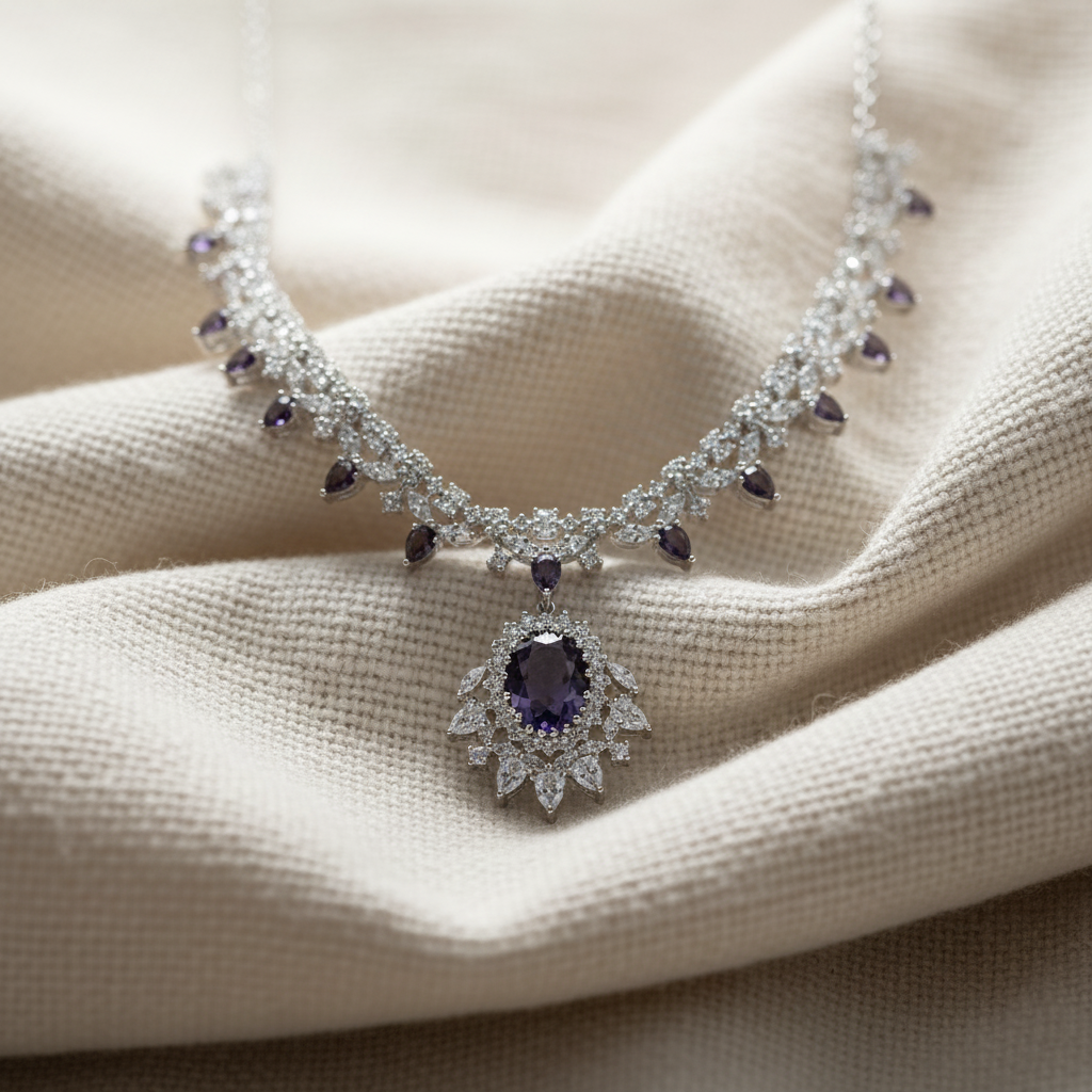 Luxury Silver Necklace with Stones – Amethyst Stone Choker with White Zircon Detailing