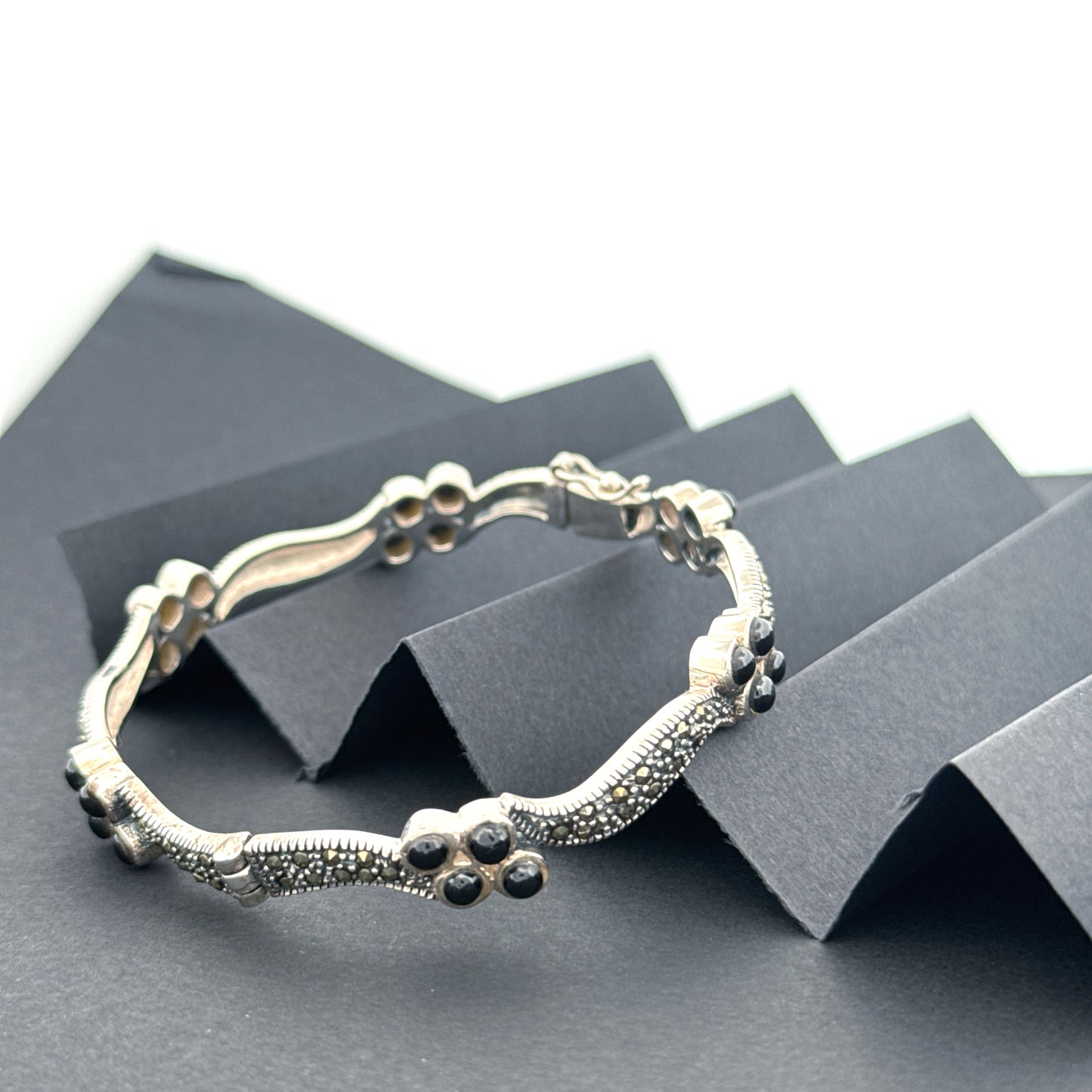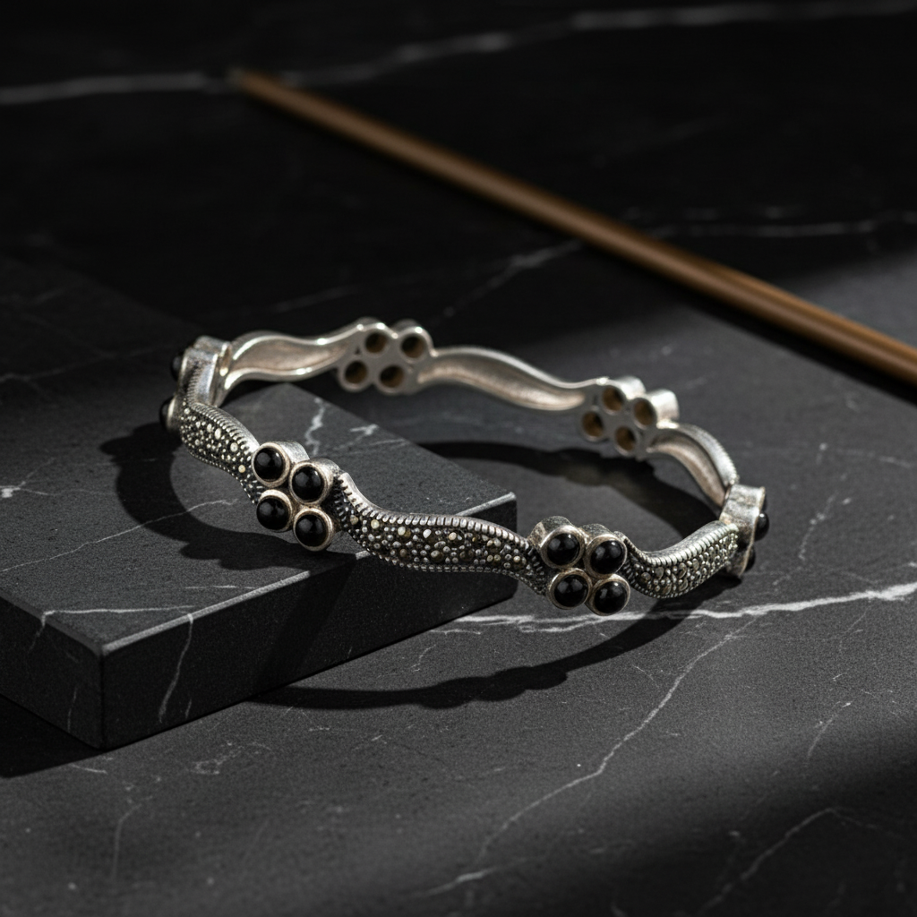 Elegant Oxidized Silver Black Stone Bangle | Handcrafted Openable Design | Karwar collection
