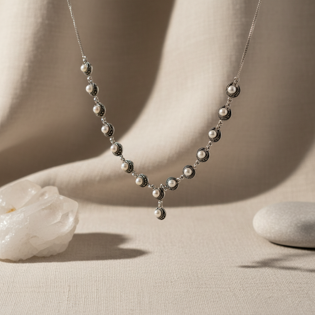 Pearl Silver Necklace – Long Oxidised 92.5 Necklace with Marcasite & Pyrite
