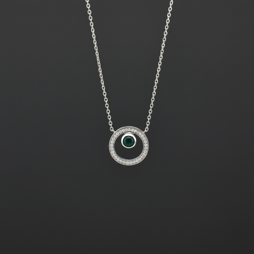 Sterling Silver Necklace with Round Pendant – White & Green Stone Rhodium Silver Necklace