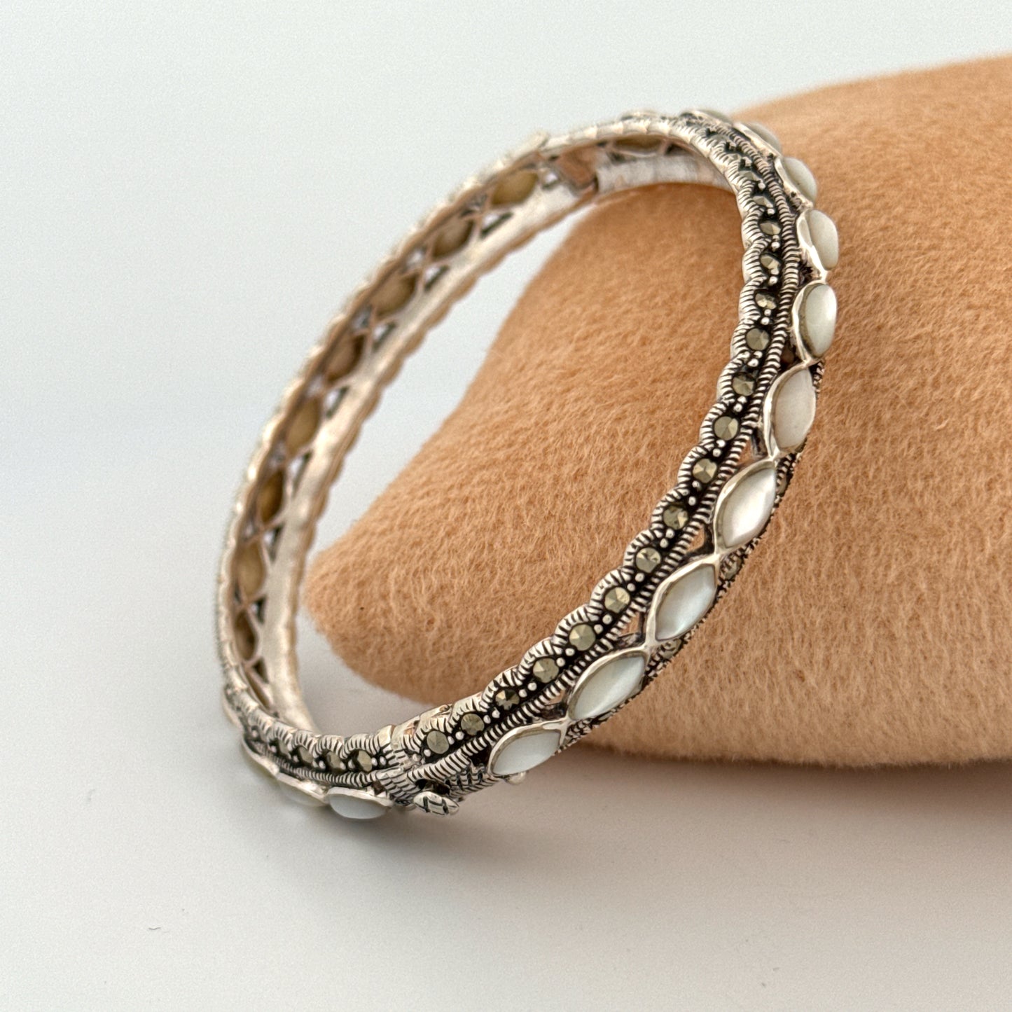 Embrace timeless charm with this antique oxidized silver bangle from Karwar Collections. Adorned with pyrite and moonstone, its openable 2.4" design adds festive elegance to any traditional look. Lightweight, versatile, and perfect for stacking or solo wear.