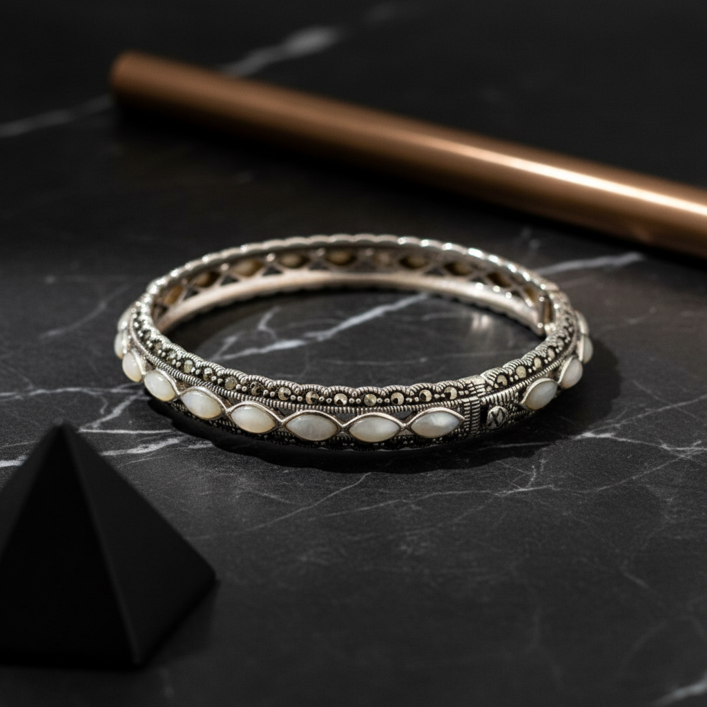 Timeless Charm – Karwar Oxidized Silver Bangle with Moonstone & Pyrite