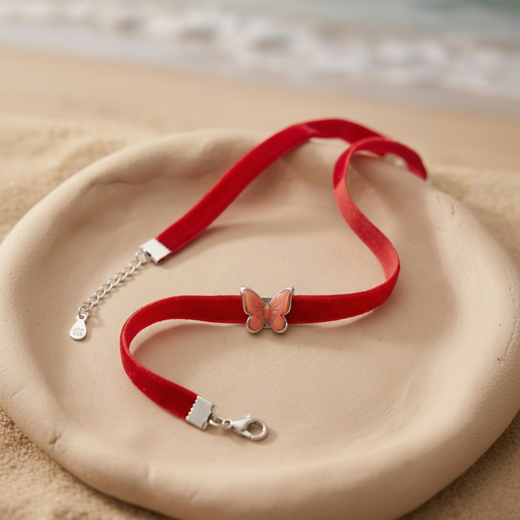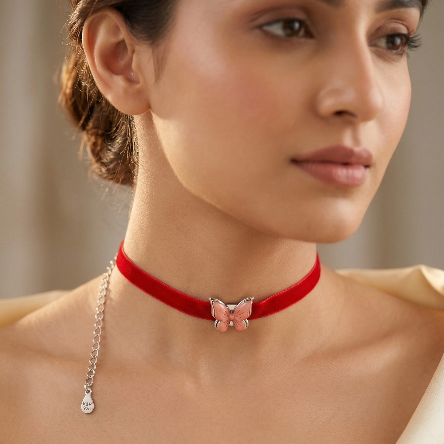 Add Coral Enamel Butterfly 925 Silver Red Velvet Choker | Bold Party Charm For Festive Gifting Occasions to the cart
