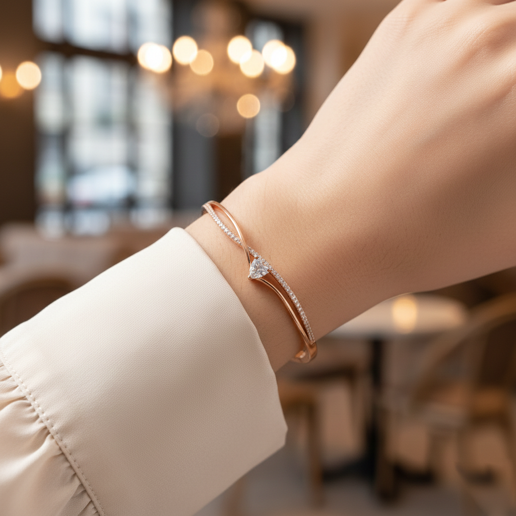 Add White AD Dual Heart 925 Silver Rose Gold Bypass Bangle | Romantic Gifting For Her to the cart