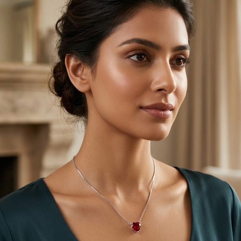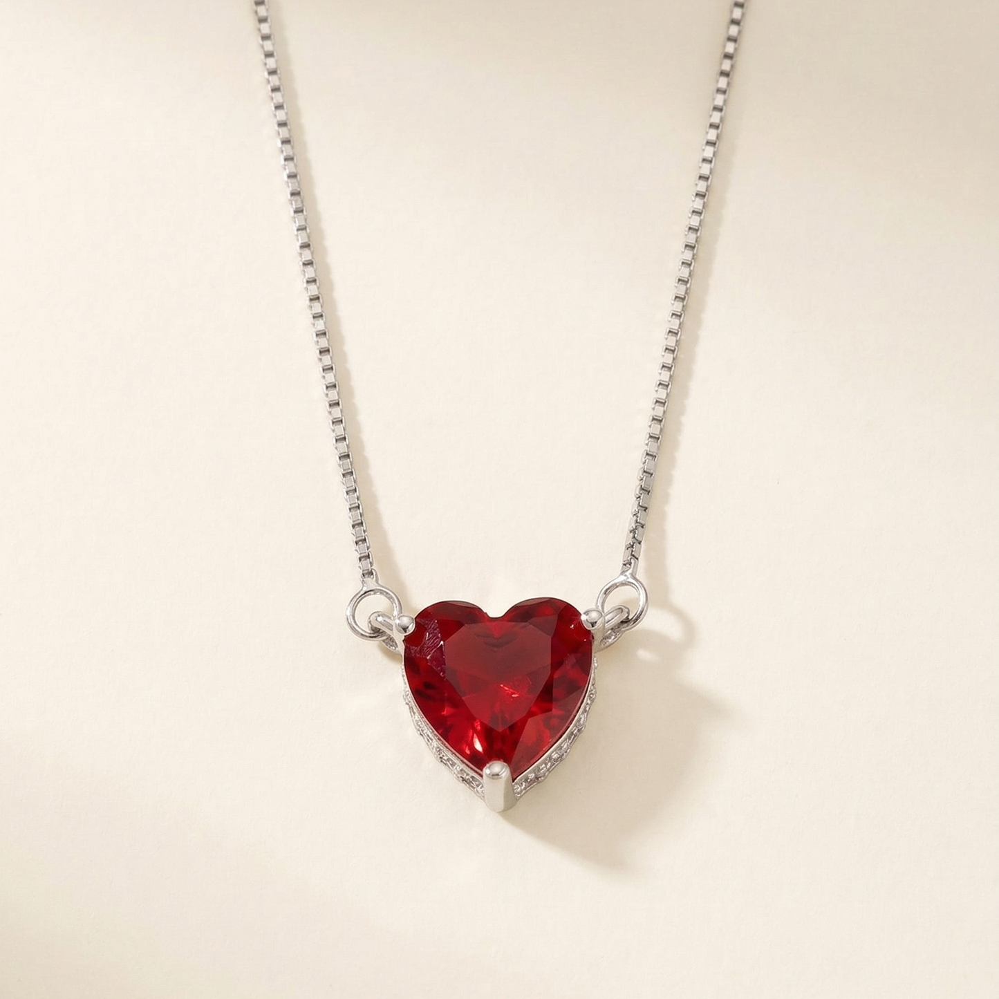 Add Red Heart-cut AD 925 Silver Solitaire Necklace | Bold Rhodium Charm For Valentine's Gifting to the cart