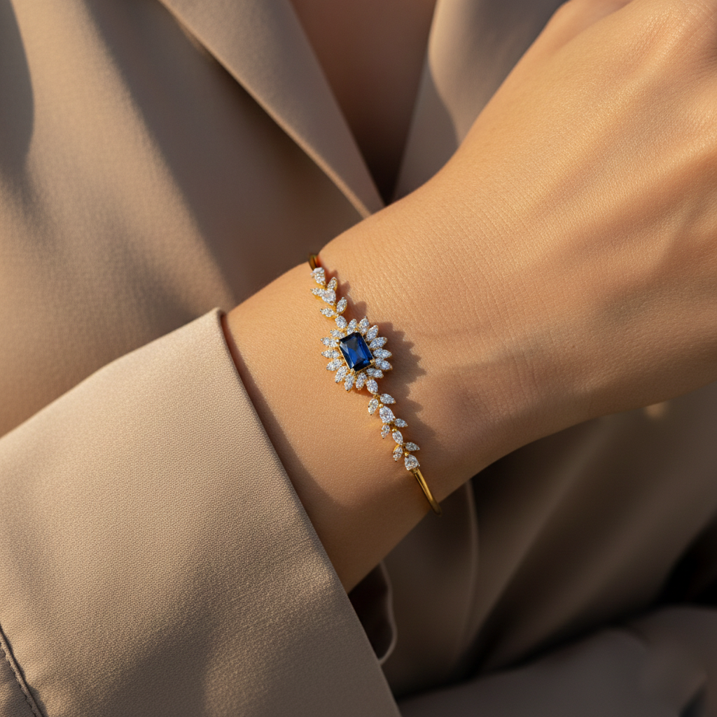 Add Blue Sapphire & White AD 925 Silver Gold Cuff Bangle | Regal Festive Statement For Her to the cart