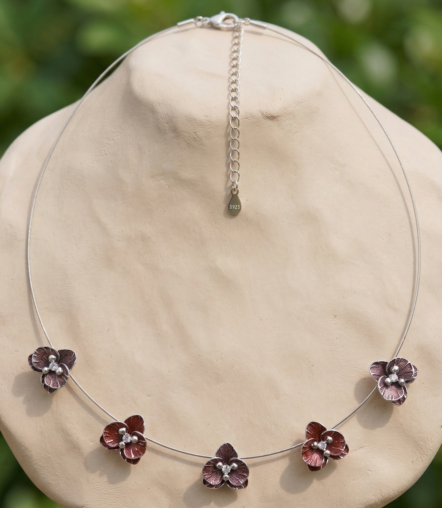 Add Copper Enamel Orchid 925 Silver Illusion Necklace | Deep Burgundy Floral Charm For Party Gifting to the cart