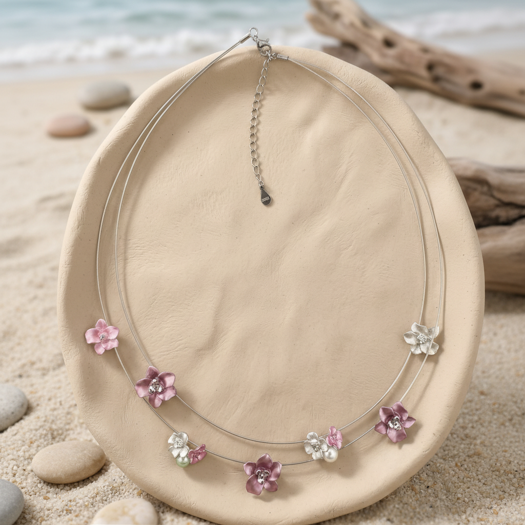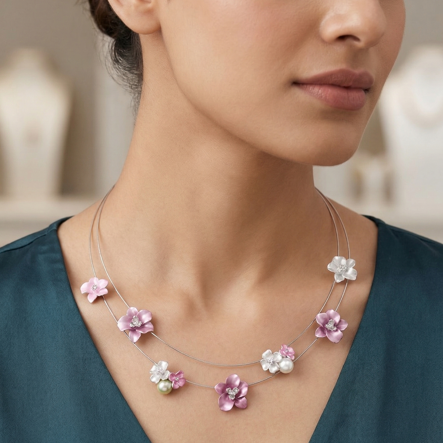 Add Pearl & Pink Enamel 925 Silver Layered Necklace | Floating Floral Charm For Wedding Gifting to the cart