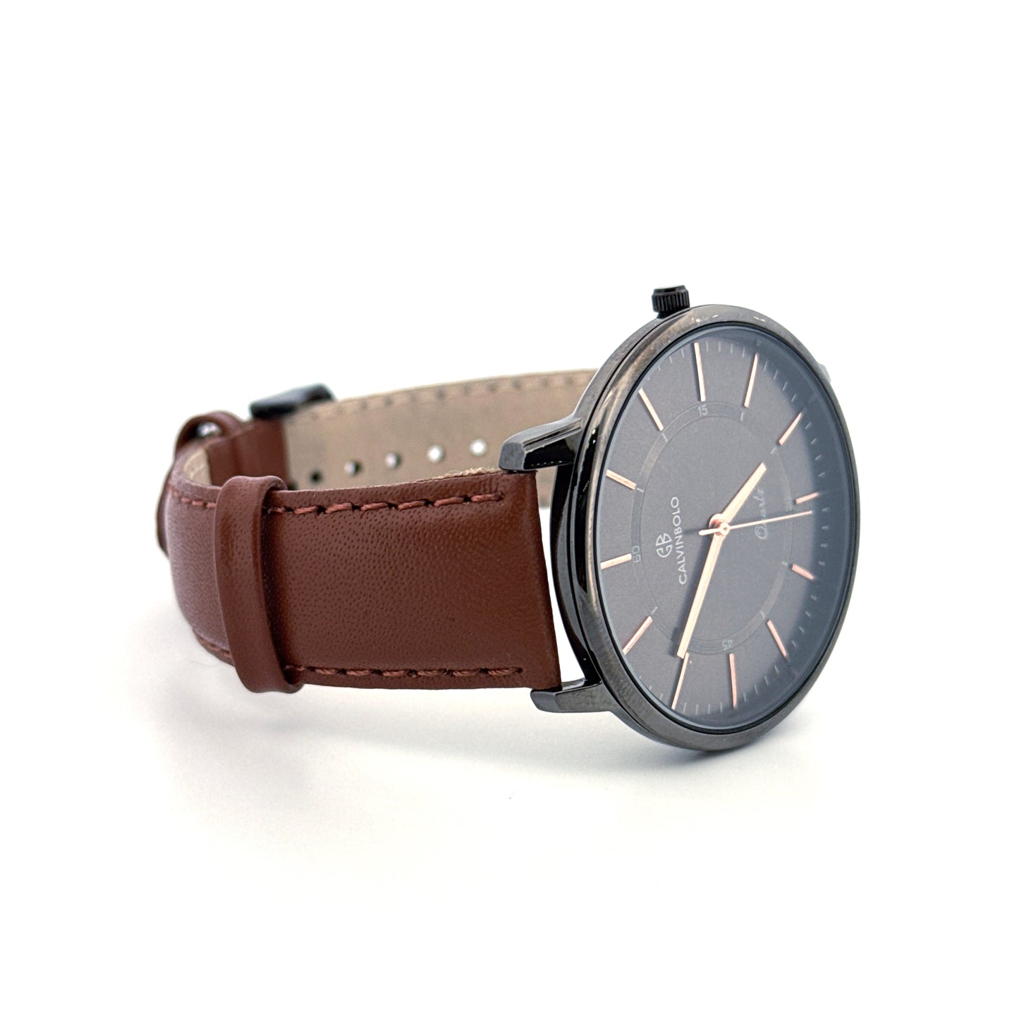 CALVIN BOLO Ultra-Slim Minimalist Watch | Gunmetal Case, Black Dial & Brown Leather Strap