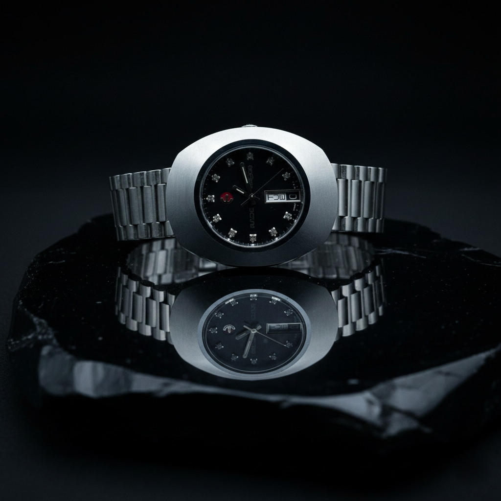 Rado Original DiaStar Automatic Watch | Black Dial, Day-Date, Jewel Indices & Integrated Bracelet