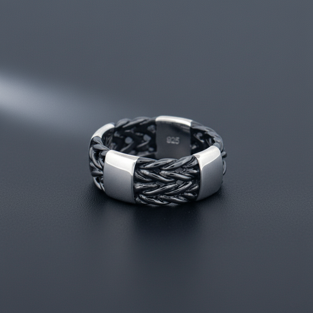 Redefine masculine style with this black silver ring for men. Made from 92.5 sterling silver with a sleek black rhodium finish, its woven braided design adds a modern, bold touch. Lightweight, durable, and perfect for daily wear or special occasions.